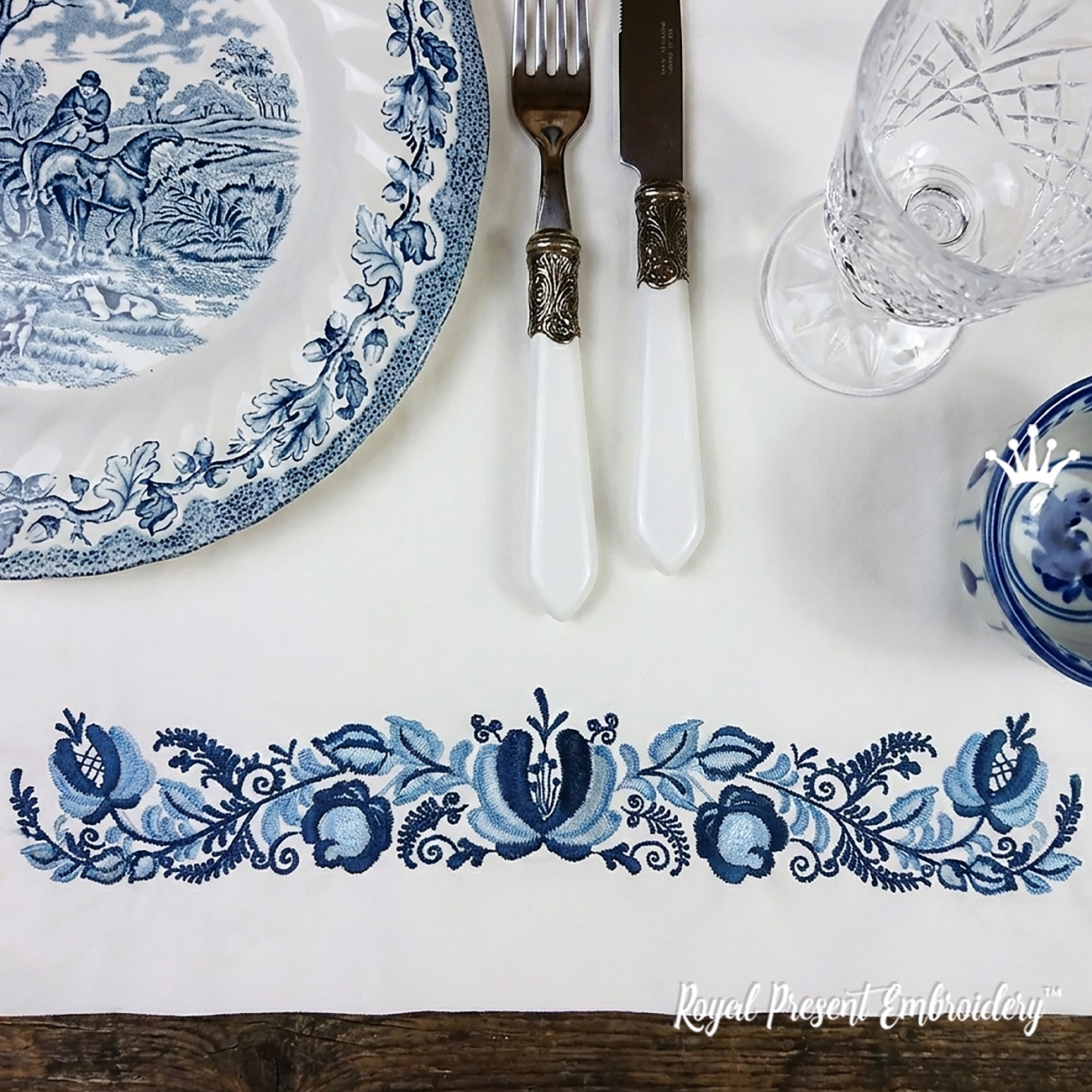 Crafted exclusively for embroidery machines, our Blue Gzhel Border design will bring new life into your home décor or clothing projects. Perfect for embellishing curtains, table linens, or stylish tote bags, this artwork promises to be an eye-catching addition to your fabric ensemble.