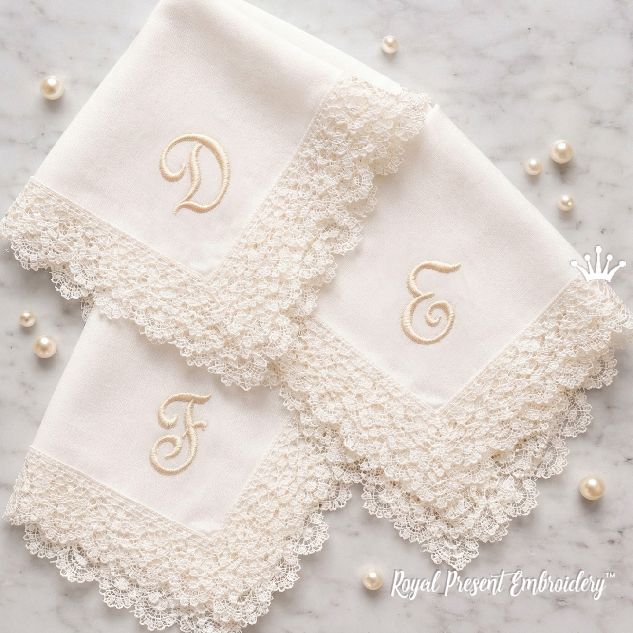 French Script Capital Letters D-E-F Set is a small machine embroidery design set for elegant monograms and delicate personalization. These uppercase letters are perfect for handkerchiefs, baby clothes, children’s garments, collars, cuffs, pockets, napkins and fine linen projects. A good choice for customers looking for very small capital letters in classic French script style for machine embroidery. Instant download digital files.