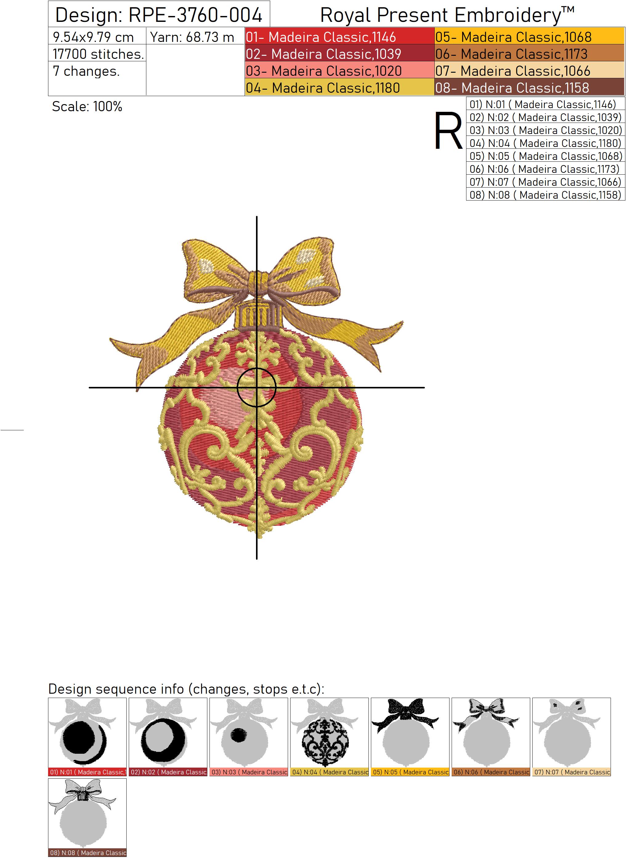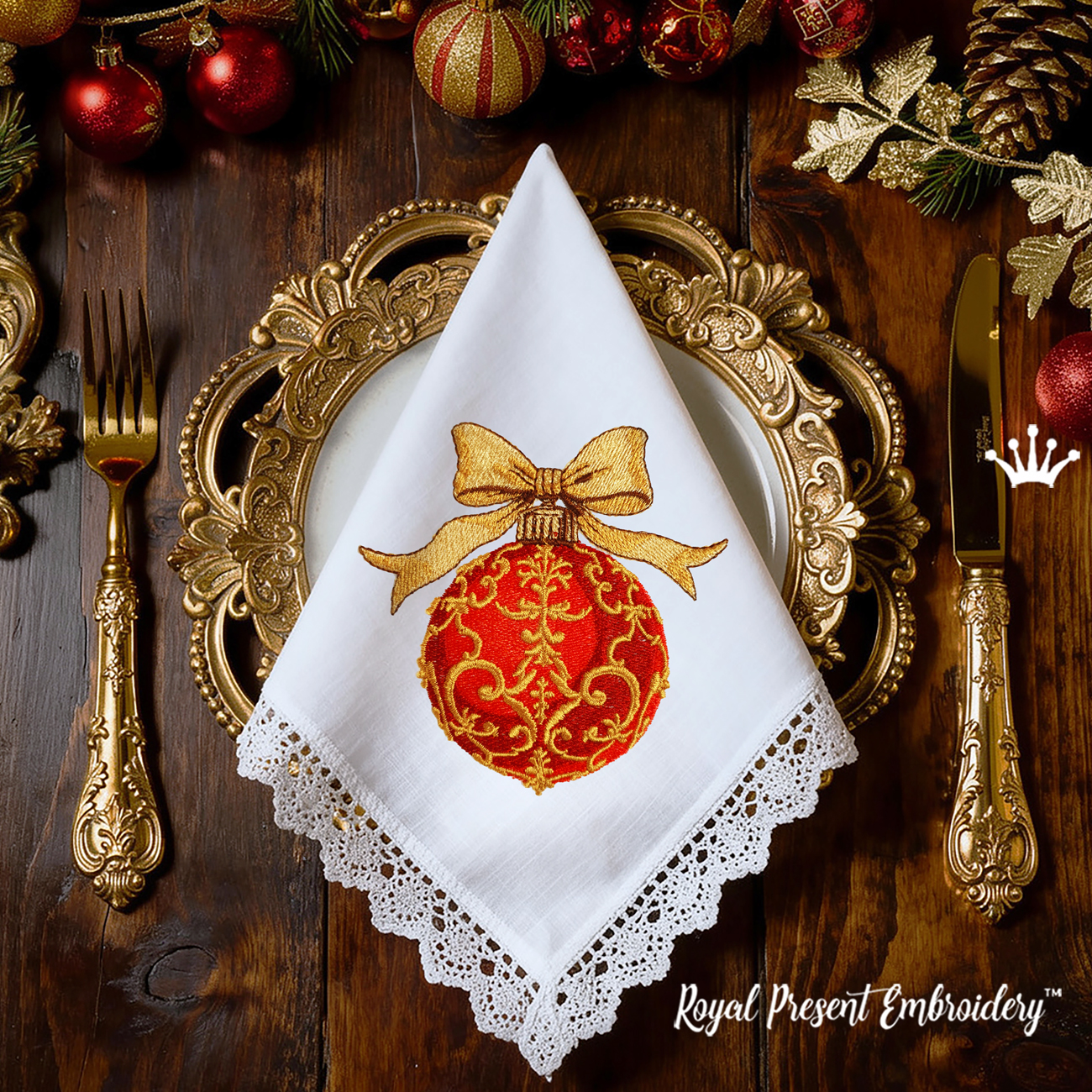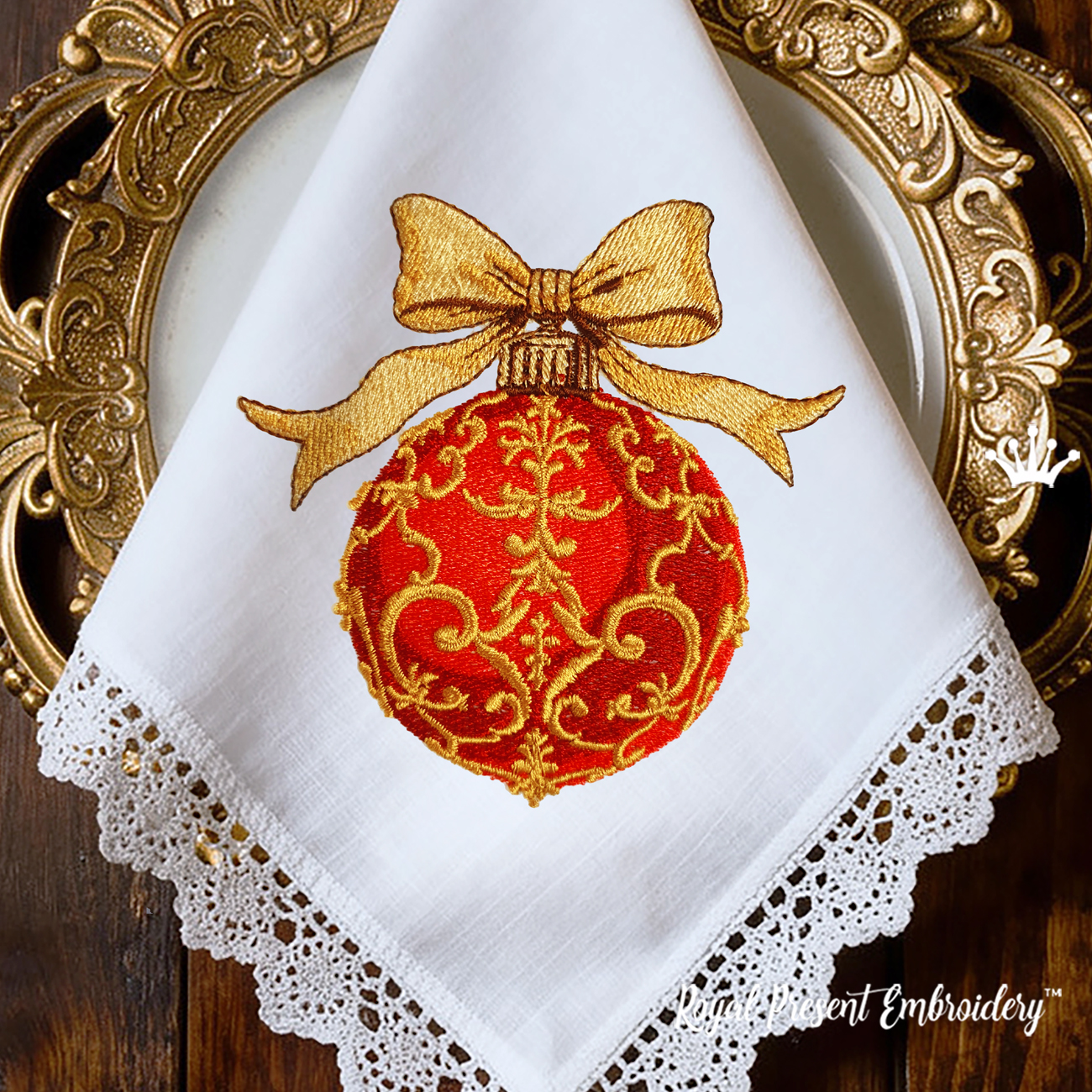 This elegant holiday machine embroidery design features a beautifully detailed Christmas ball adorned with a rich baroque-style pattern and a luxurious golden bow. Its refined lines, ornamental swirls, and festive warmth make it an excellent choice for decorating seasonal textiles. The design blends classic Christmas aesthetics with timeless baroque elegance, making it suitable for both traditional and upscale décor. It pairs perfectly with the companion piece, the Christmas toy with a baroque pattern and a bow machine embroidery design, allowing you to create coordinated holiday sets.