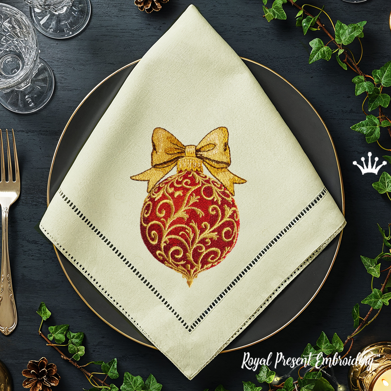 This festive machine embroidery design will bring elegance and beauty to your holiday creations, inspiring you to craft even more unique and refined seasonal projects. This design is a companion to the Christmas Ball with Golden Bow and Pattern machine embroidery design.