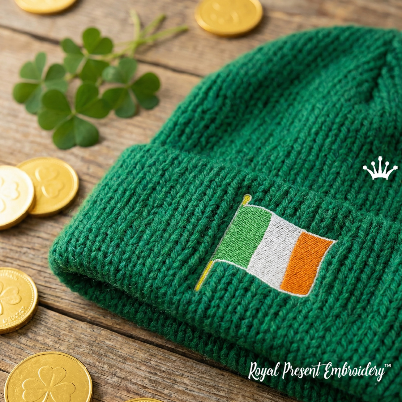 Drapeau irlandais Motif de broderie machine pour la Saint-Patrick présenté en trois tailles. Brodez-le sur les vêtements des fans de cette joyeuse fête.
