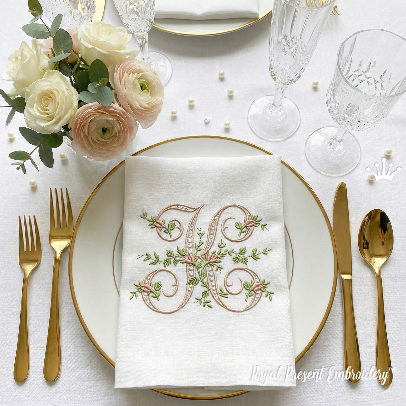 Élégant monogramme floral vintage représentant la lettre K ornée de roses joliment détaillées et de feuilles gracieuses. Cette composition raffinée combine un lettrage classique avec des accents floraux romantiques, ce qui le rend parfait pour la broderie personnalisée et les projets textiles de luxe.