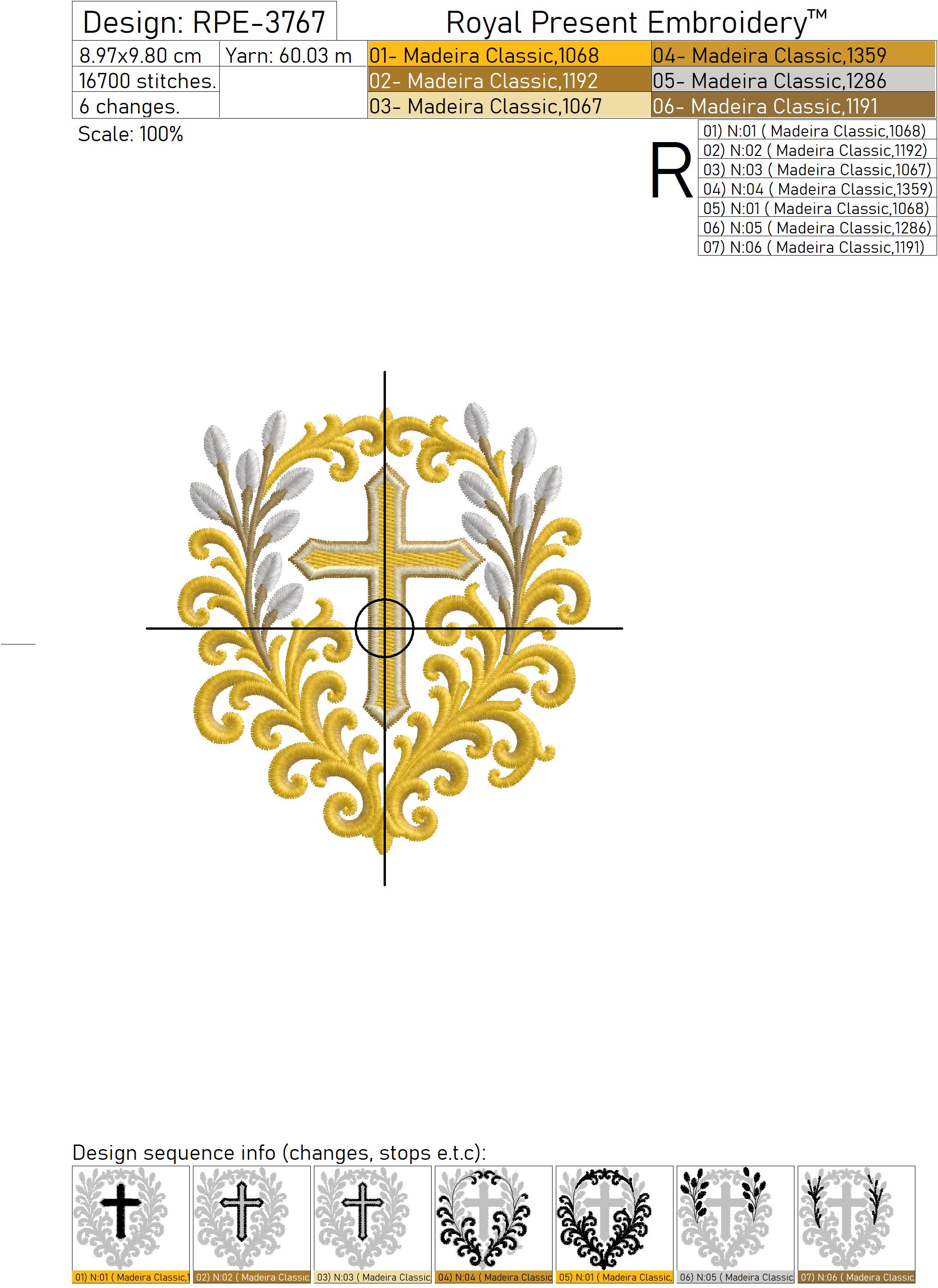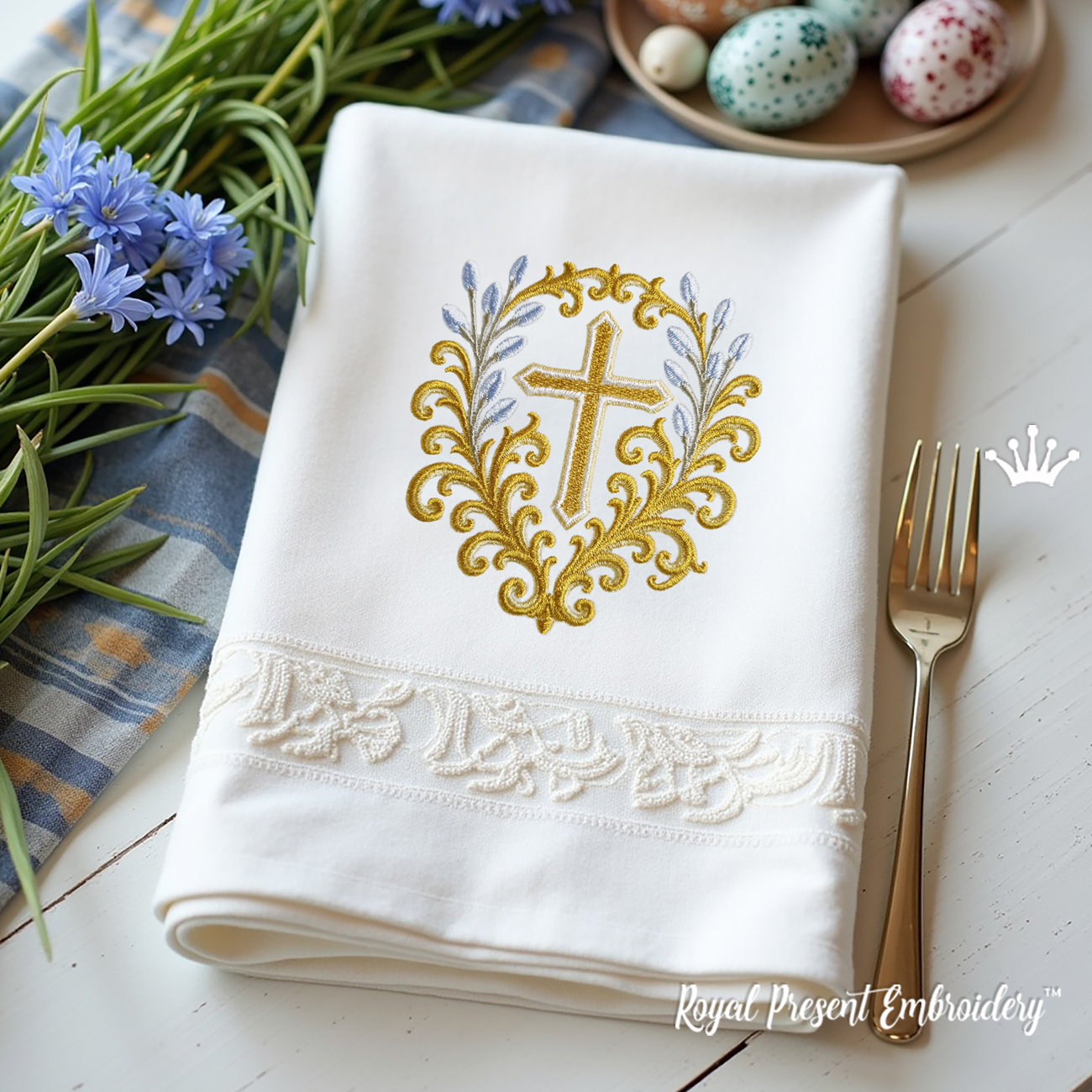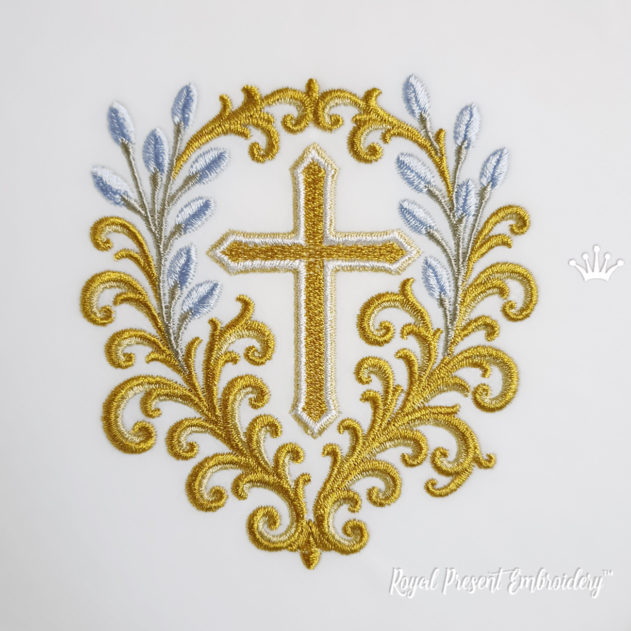 Lacroix chrétienne avec décorations dorées est un motif de broderie machine exquis de style baroque avec des éléments de saule à chatte et un symbolisme orthodoxe.