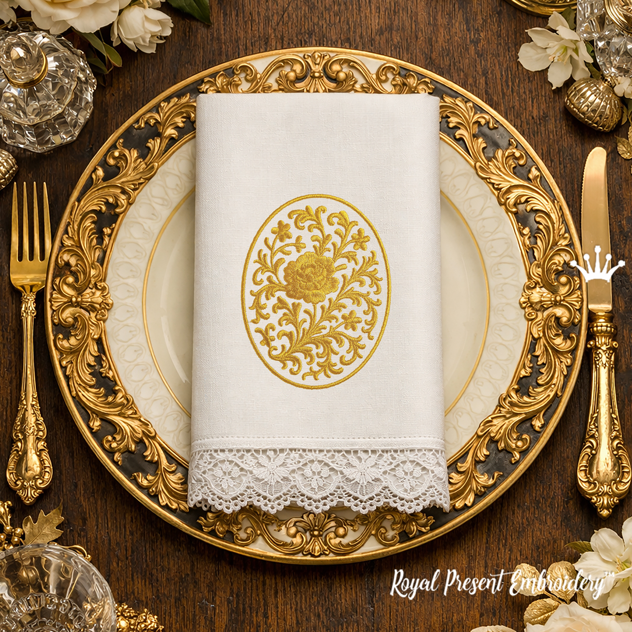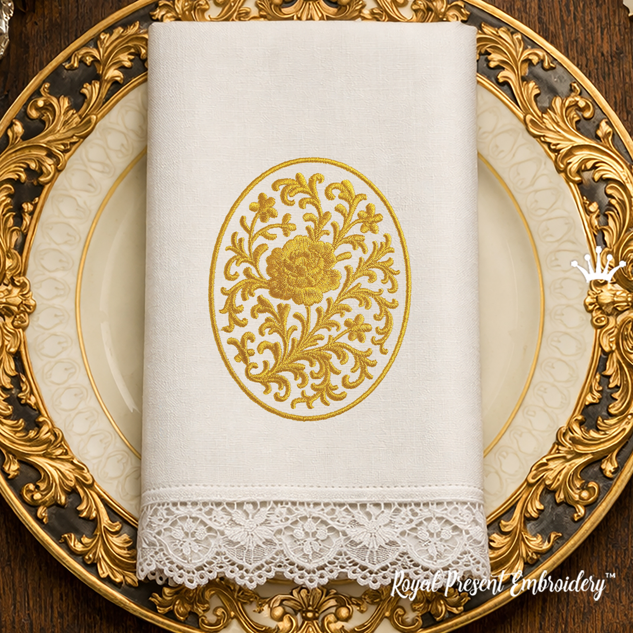 Ornement ovale de roses - motif de broderie machine dans un élégant style floral et vintage. La composition ovale raffinée avec des roses ajoute une touche classique et luxueuse au linge de table, aux serviettes de table, aux oreillers, à la décoration intérieure et aux projets de cadeaux. Parfait pour les intérieurs intemporels et les travaux de broderie sophistiqués. Disponible en téléchargement immédiat et prêt à piquer sur votre machine à broder.