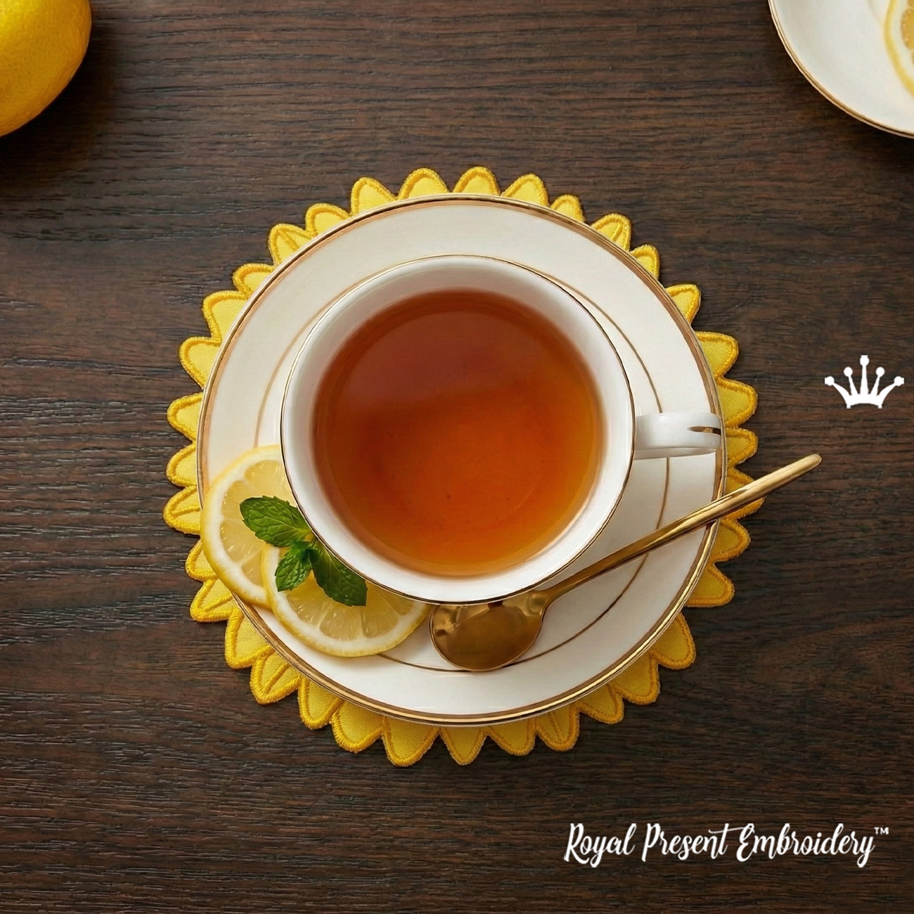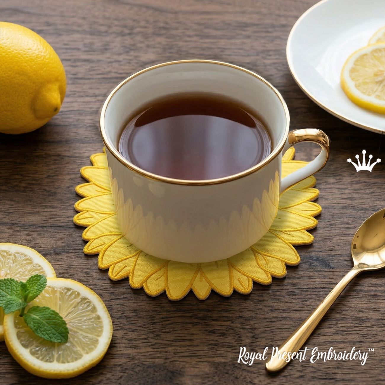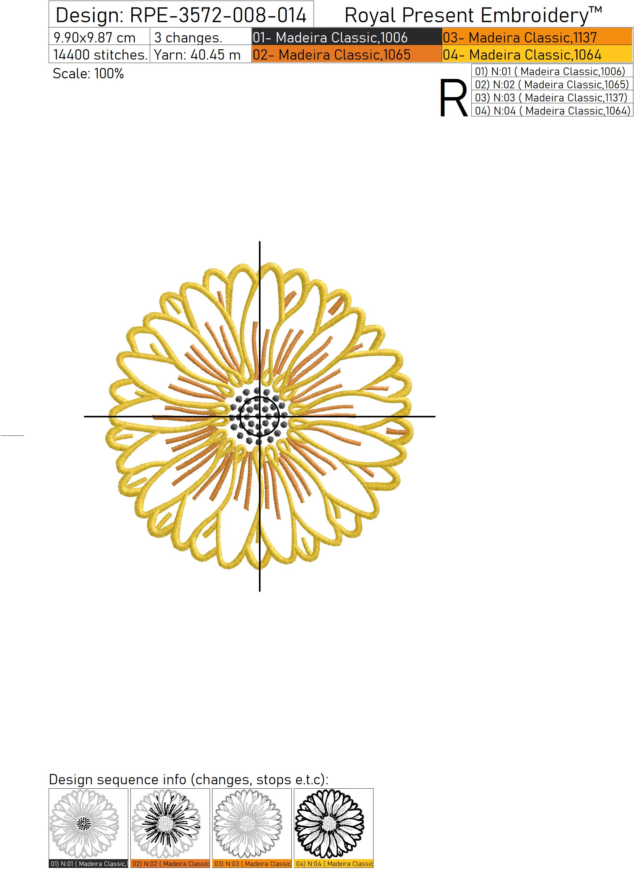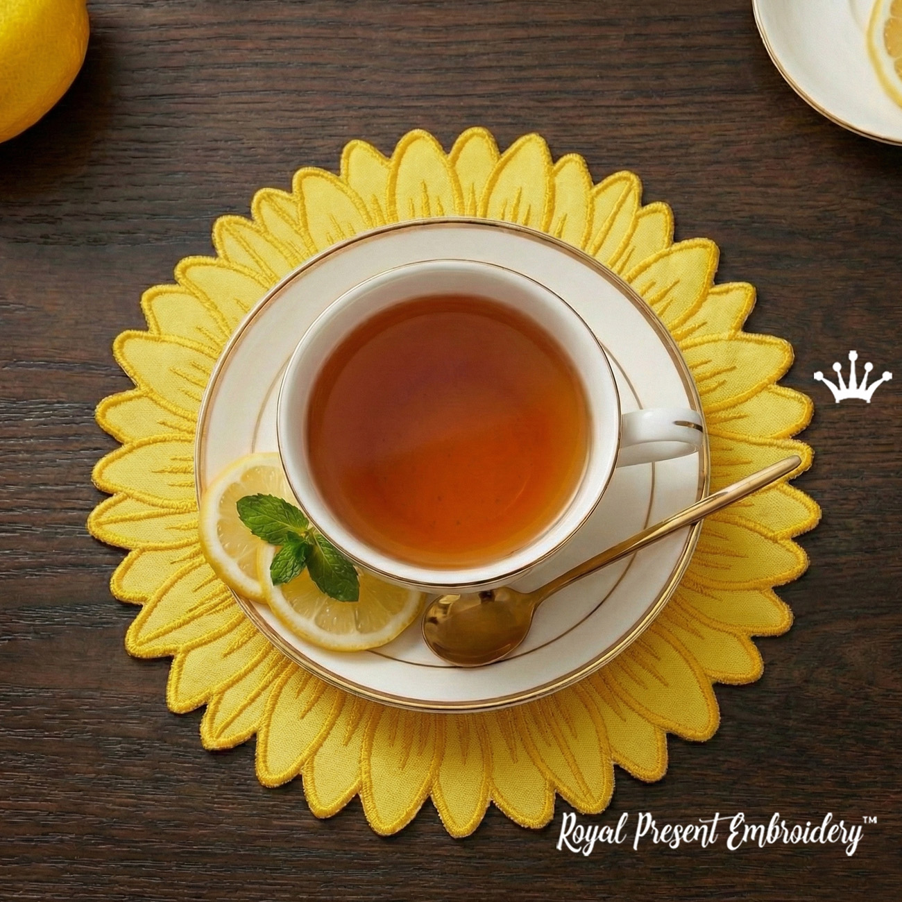 Le motif est entièrement cousu dans le cercle (ITH - In the Hoop), ce qui rend le processus simple et agréable. Le napperon fini peut être utilisé pour des assiettes à dîner, des assiettes à dessert, des tasses à café, des mugs ou des décors de table décoratifs. Les pétales de tournesol créent un cadre floral lumineux qui fait sensation sur n'importe quelle table.