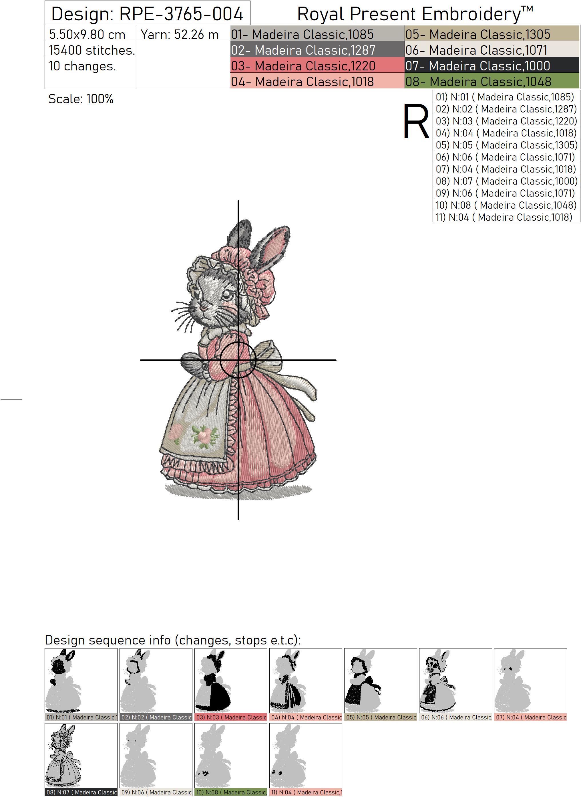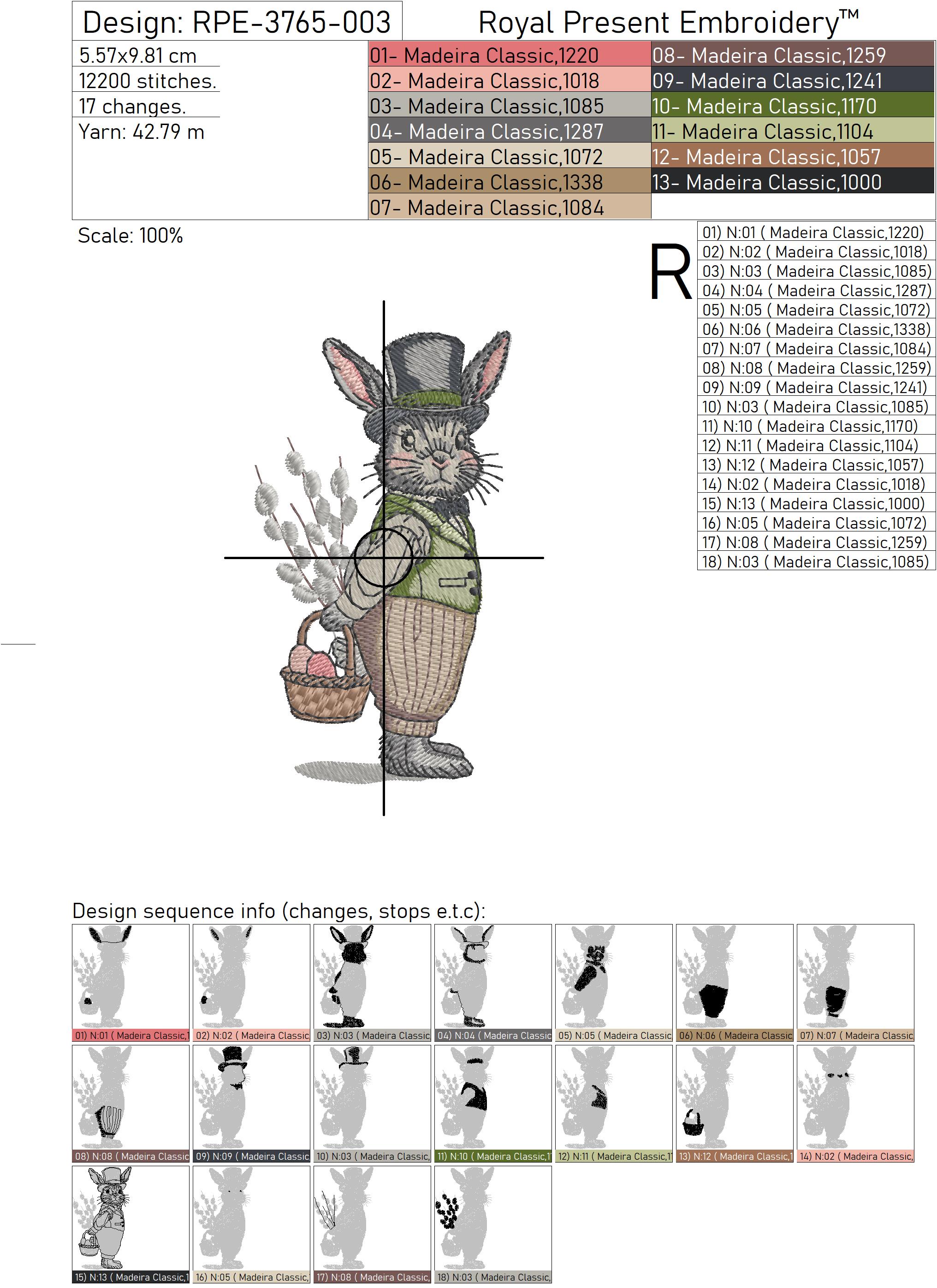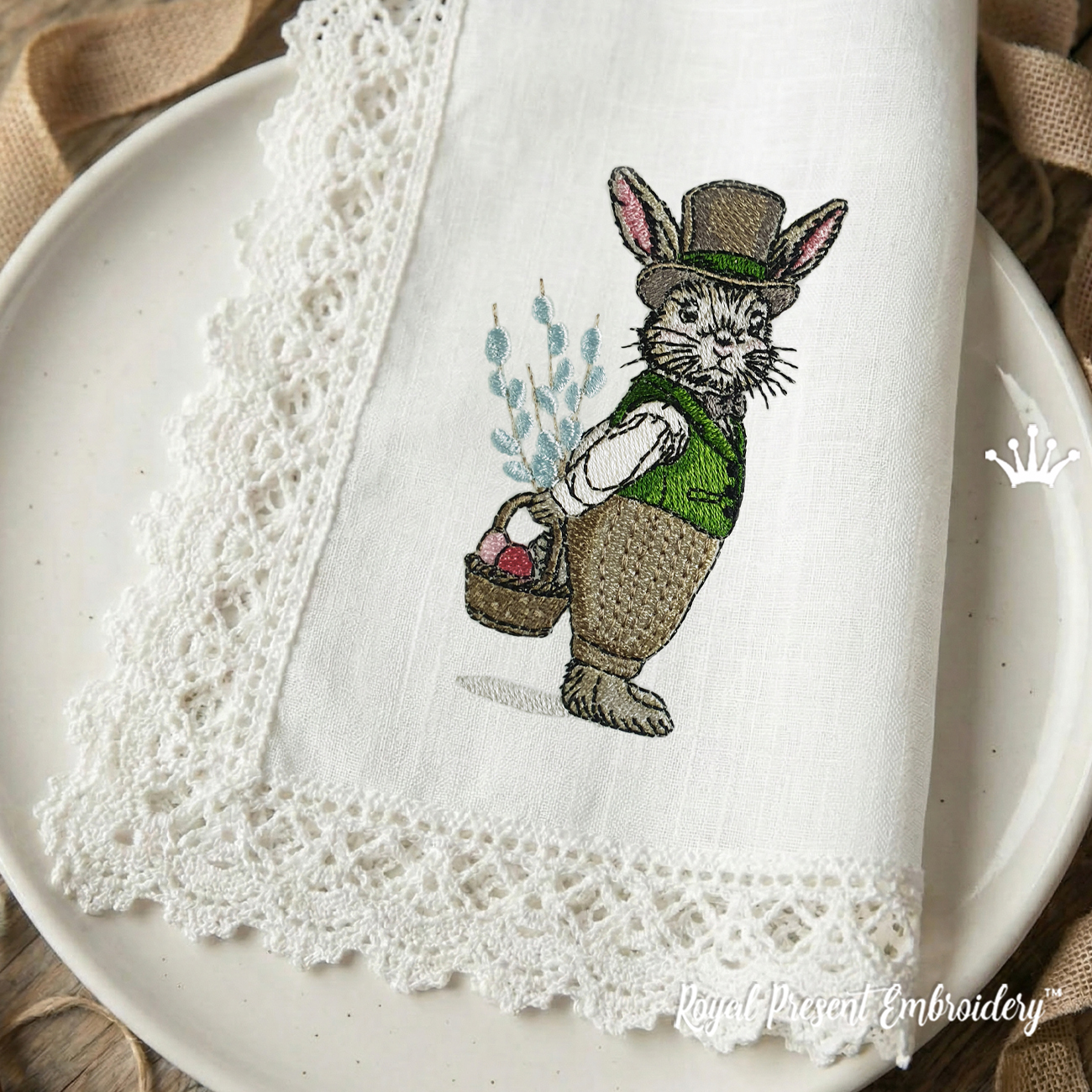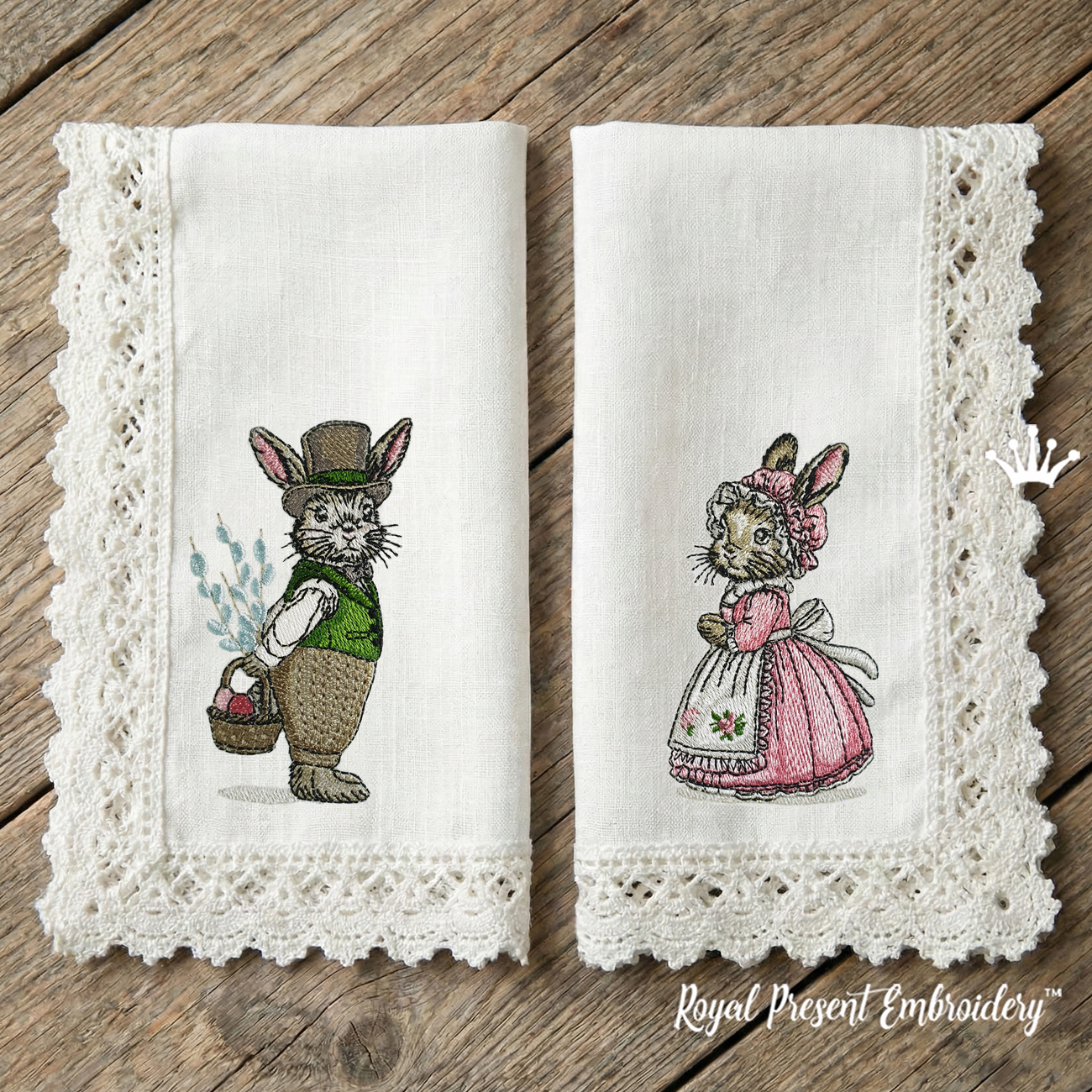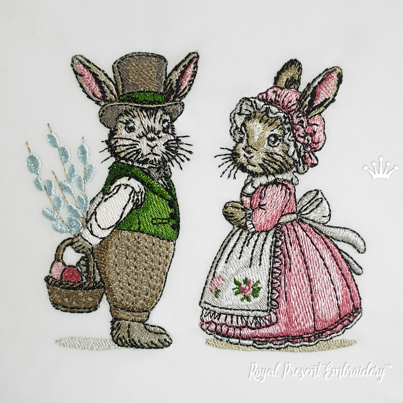 Two Vintage Spring Bunnies Set est un motif de broderie machine avec une charmante atmosphère de Pâques. Le set comprend deux lapins de style vintage : un monsieur avec un chapeau haut de forme et un panier et une dame avec une robe et un bonnet de printemps.
