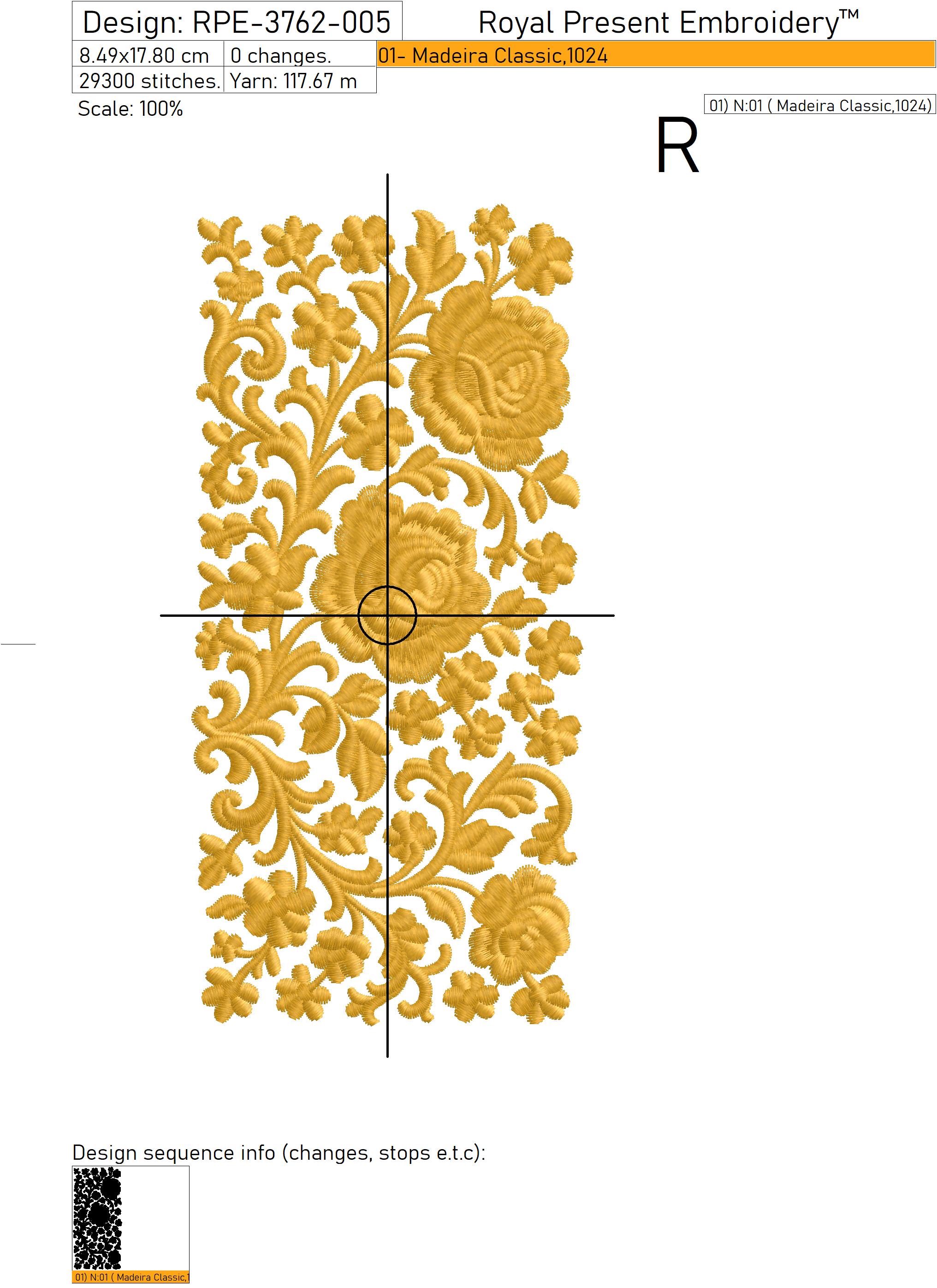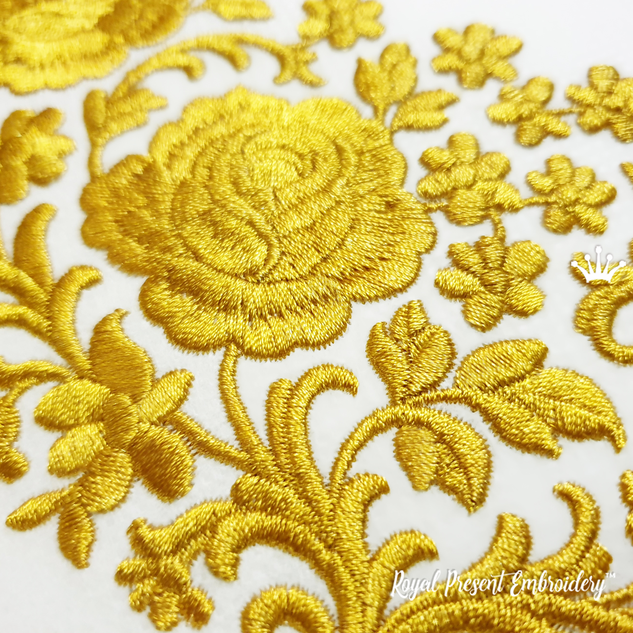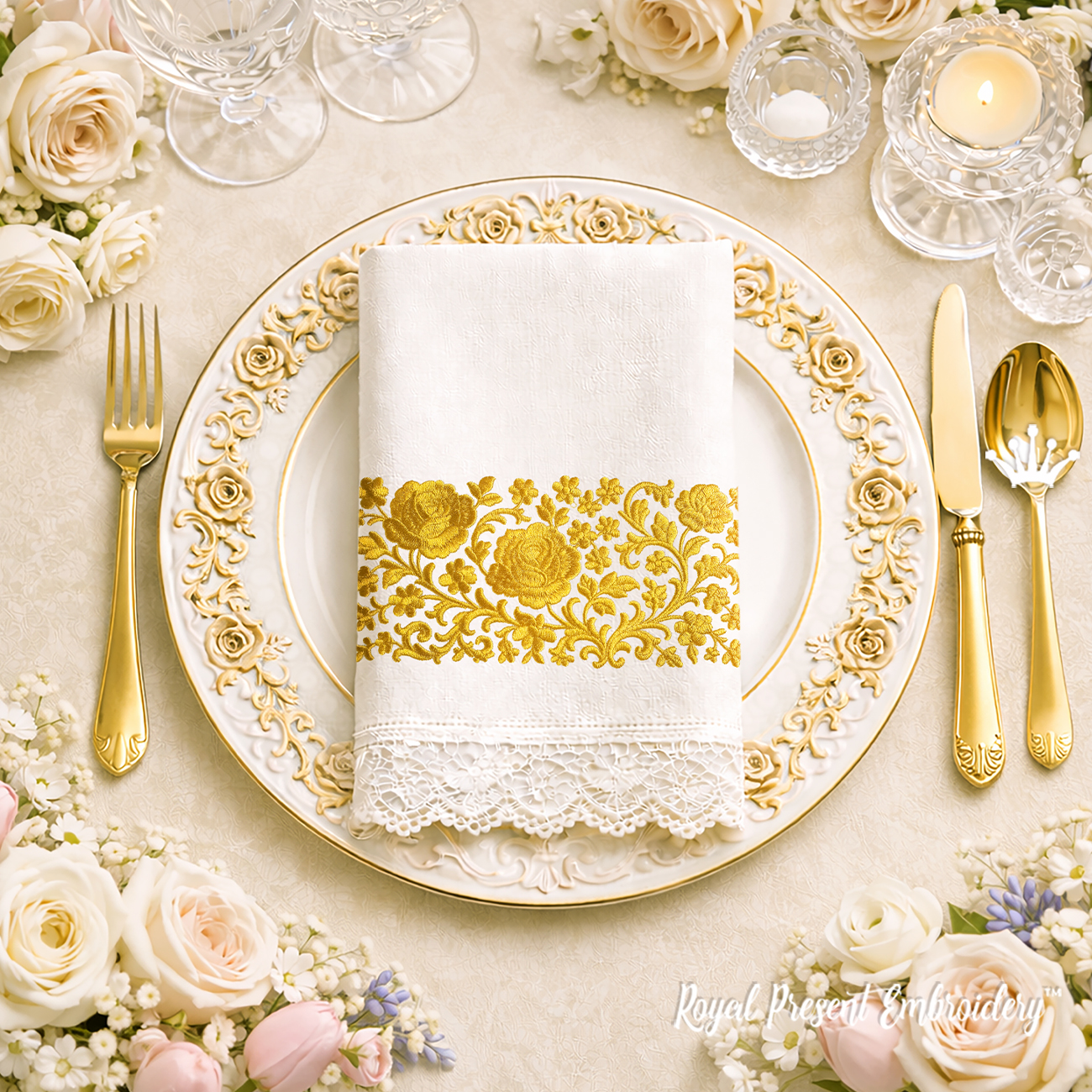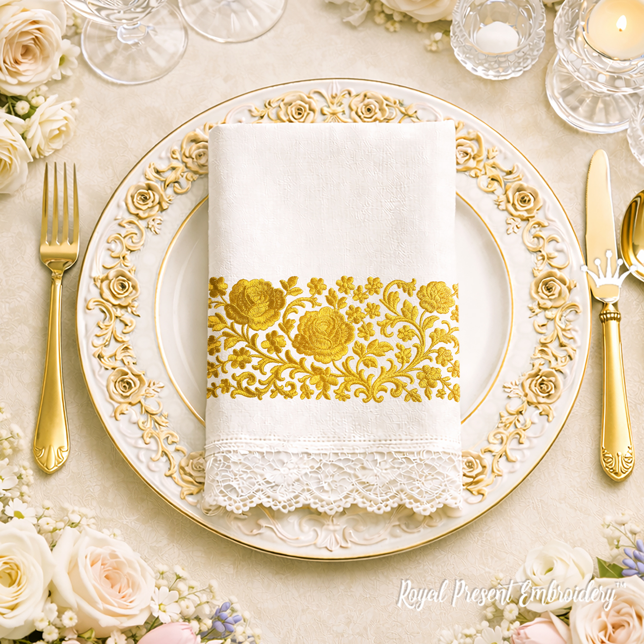 Le motif est créé dans un style floral et classique vintage. Les motifs de roses et les lignes ornementales fluides donnent à la bordure un aspect intemporel et décoratif.