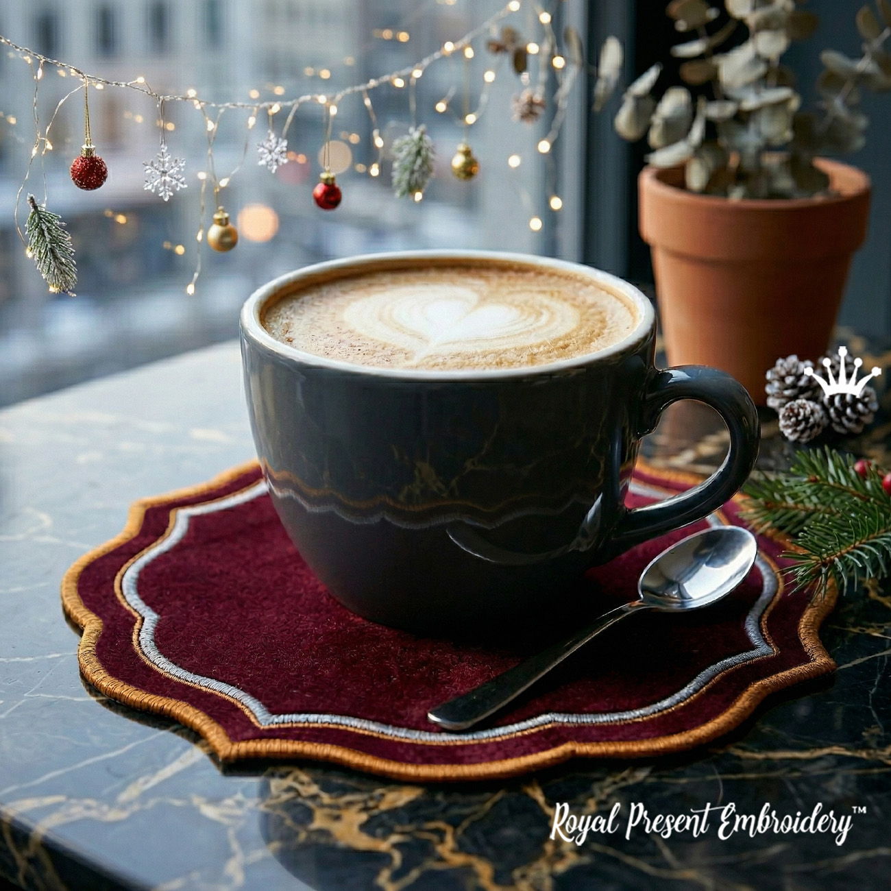 ITH Shaped Mug Rug embroidery design is a beautiful in-the-hoop project for creating an elegant mug rug, coaster, or cup mat with a decorative silhouette. It is perfect for coffee, tea, cocoa, and festive table styling, adding a cozy handmade touch to your kitchen, dining area, or holiday decor. This design is a lovely choice for machine embroidery lovers who enjoy practical and stylish projects for everyday use or gift making.