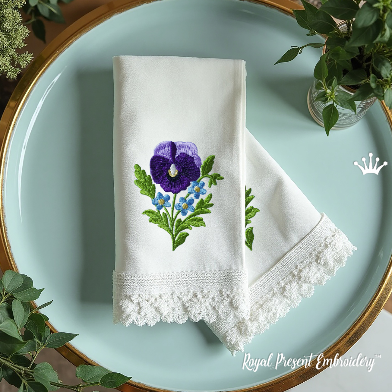 Pansies and Forget-Me-Nots is an elegant machine embroidery design in a soft floral and vintage style, perfect for decorating napkins, towels, cosmetic bags, and other textile items.