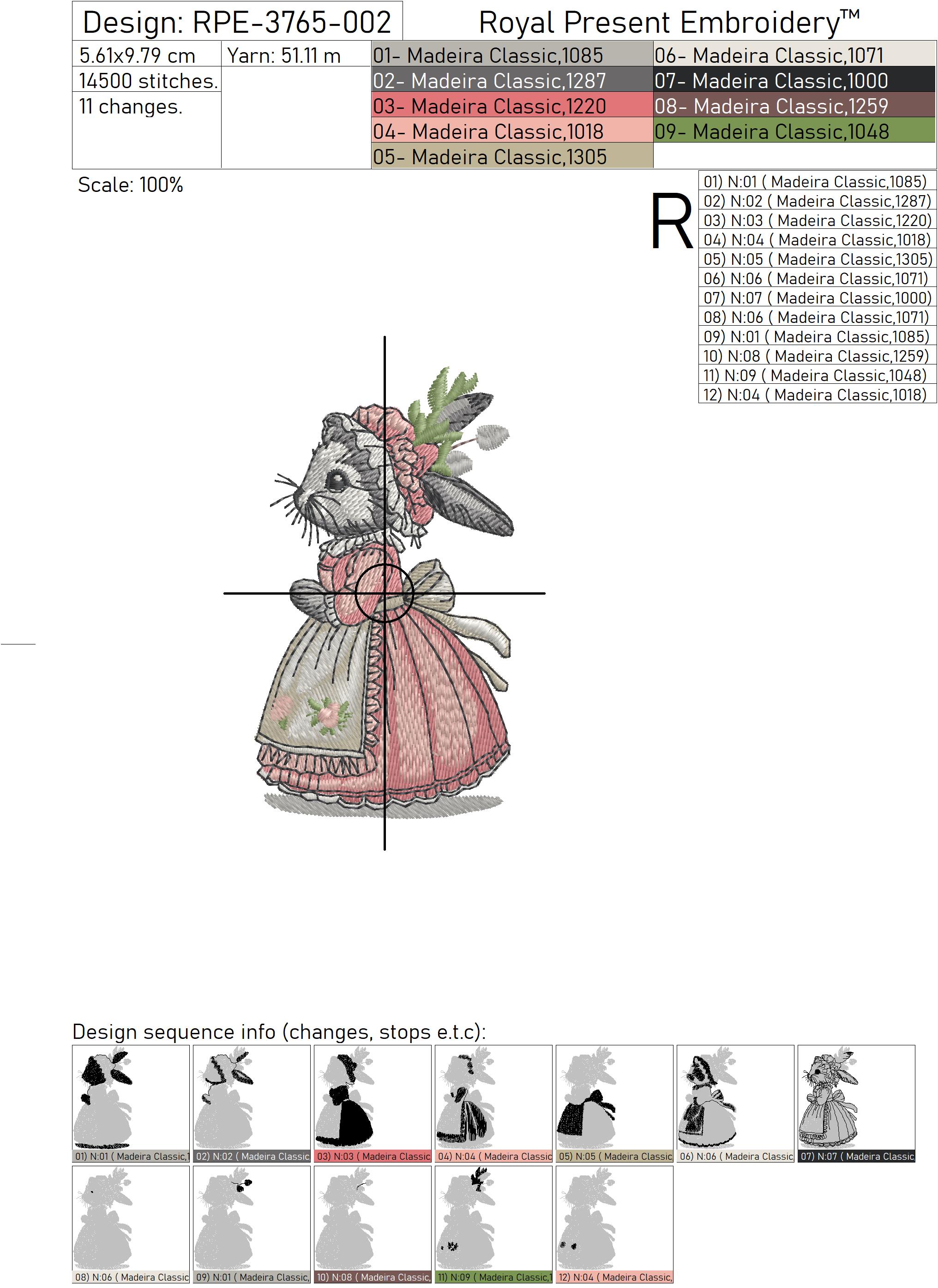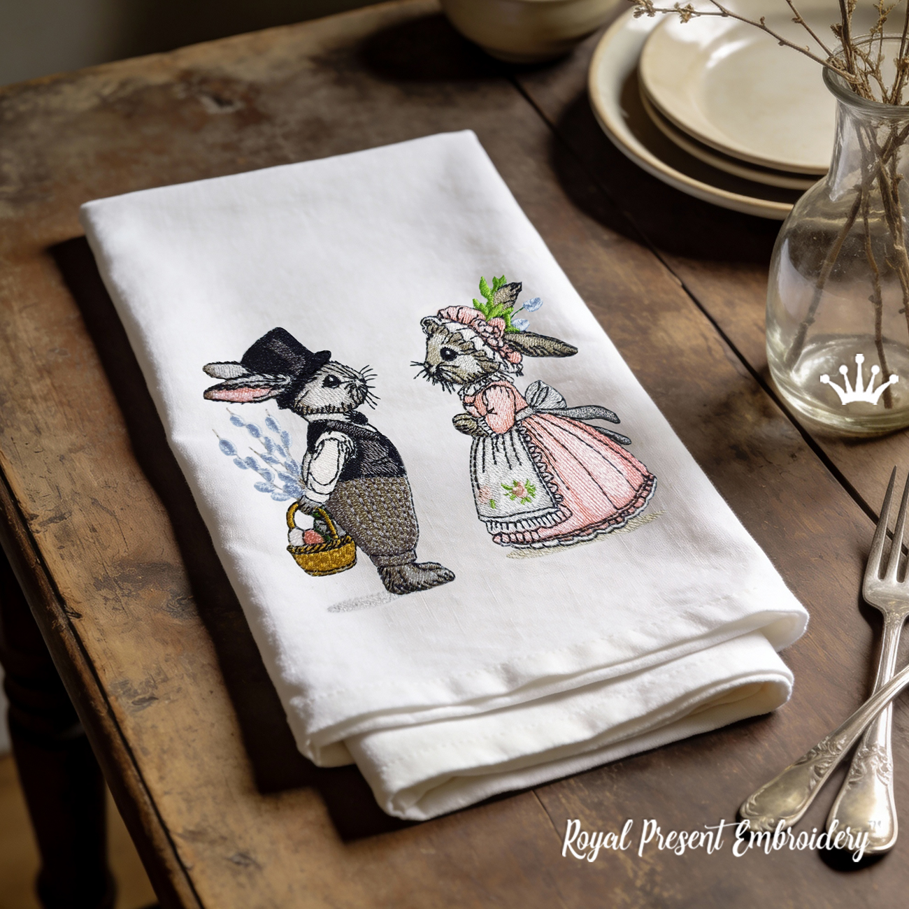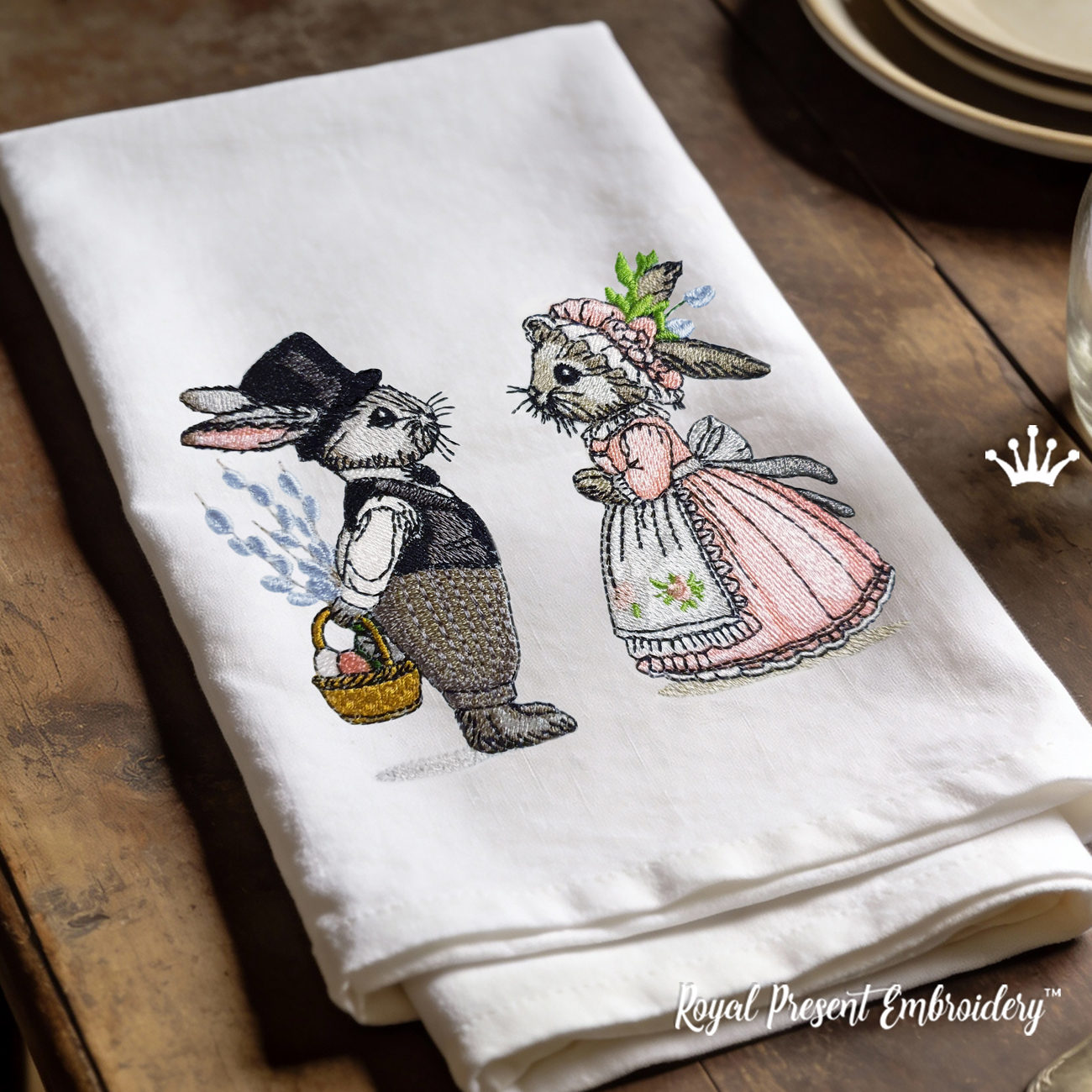 The charming Two Vintage Spring Bunnies Set machine embroidery designs tell a delicate love story in the style of antique illustrations. A bunny in a top hat carrying a basket of Easter eggs and a lady bunny in a pink dress and bonnet look like characters from a vintage Easter card. These designs are perfect for Easter decor, children’s linens, napkins, towels, and other home textile accents.